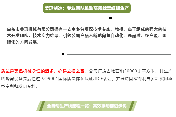 在這一方面,啟東市美迅機(jī)械有限公司早已深諳其道。作為中國(guó)包裝聯(lián)合會(huì)成員單位,美迅機(jī)械是一家專業(yè)從事蜂窩紙芯、蜂窩紙板成套生產(chǎn)設(shè)備研發(fā)、制造、銷售的廠家,也是國(guó)內(nèi)較早制造全自動(dòng)蜂窩紙板連續(xù)生產(chǎn)線的企業(yè)。